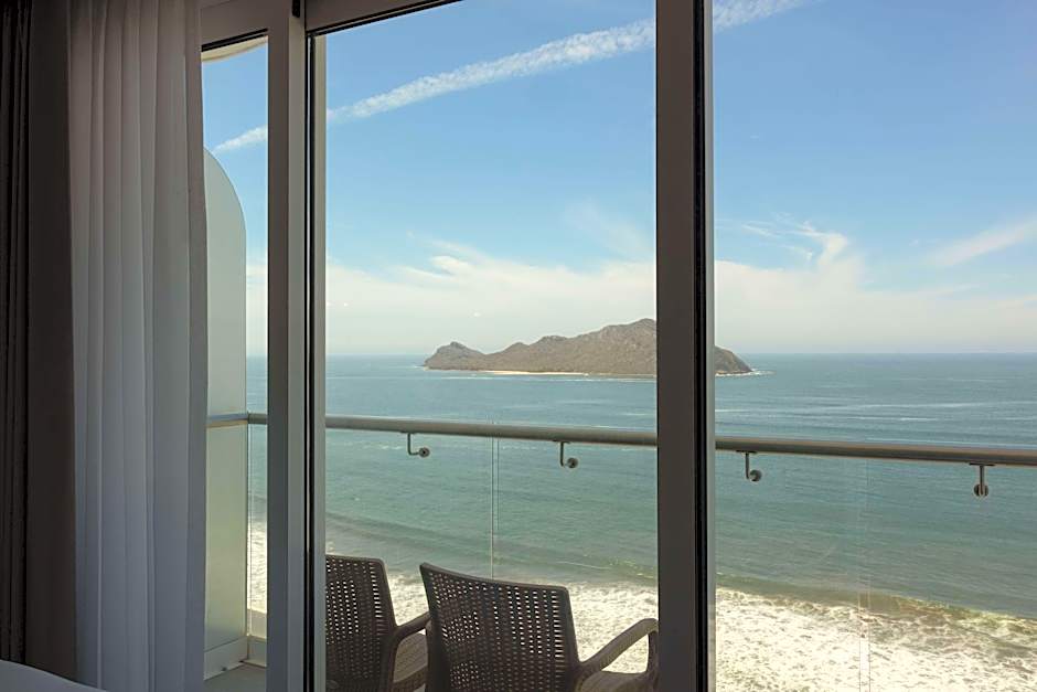 On-site Beach umbrellas (free), Beach chairs/Loungers, Sun deck, Terrace, Elevator, Bar, and Free toiletries round out the amenities. The beachfront location pairs with sun and sea access, making this Mazatlán retreat a practical pick for travelers seeking convenience and shoreline views.